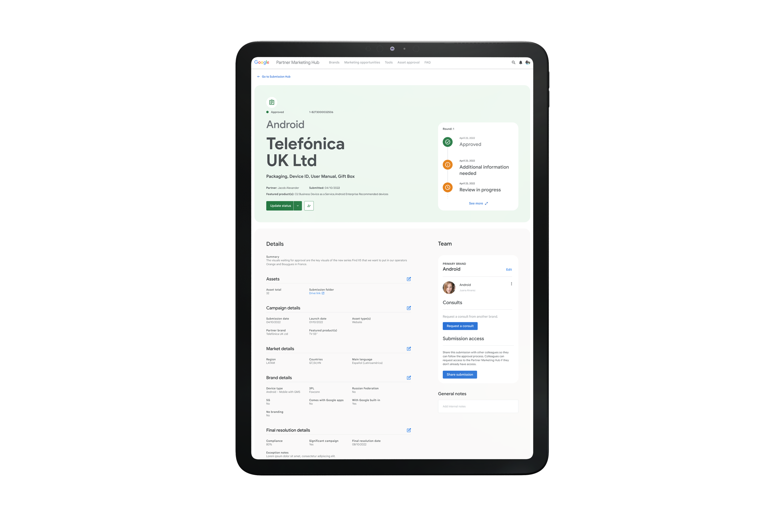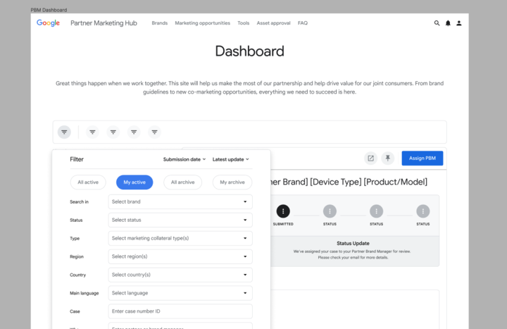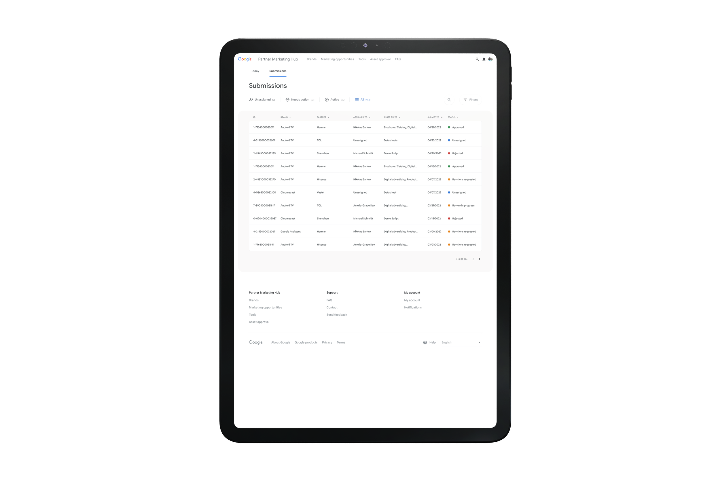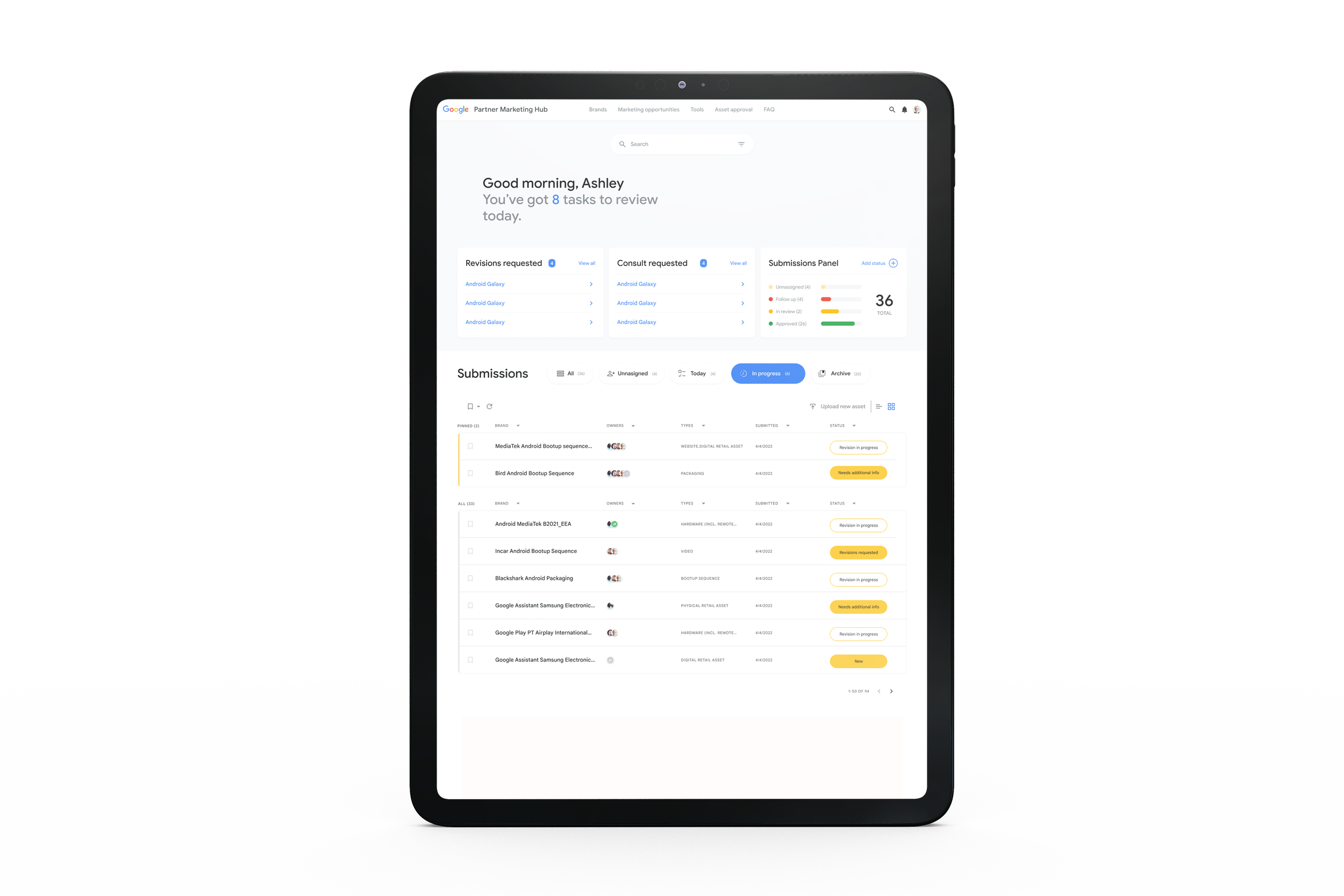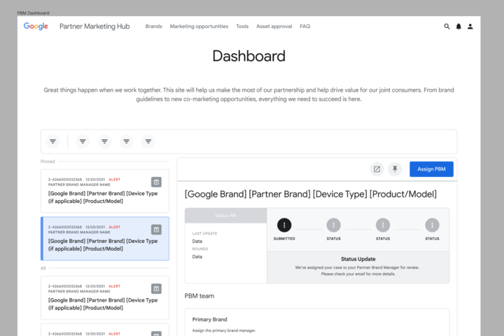 Create a simple experience on PMH where partners can track the current status of all of the assets they’ve submitted for Google brand review and approval.