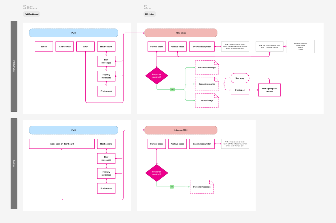 These helped us create a physical checklist of what needs to be included in our next step, user flows. This was super critical to formulate what pages communicated with each other, and their level of hierarchy. The Sr UXD and I brainstormed together how the flow might be most effective and shared it with our team for approval.