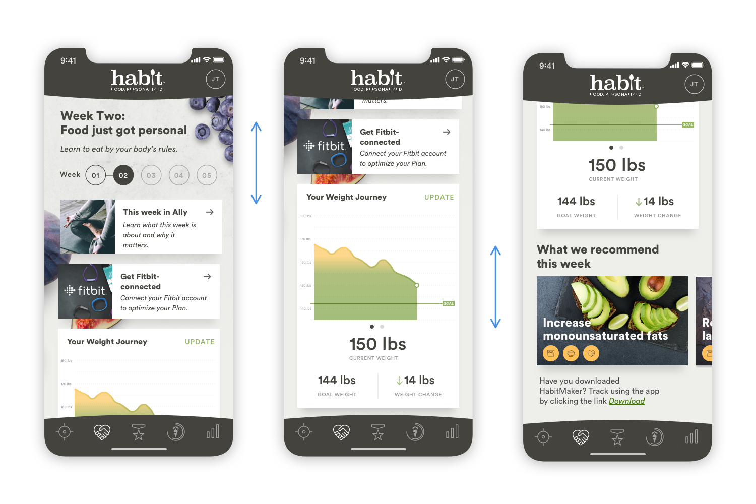 The Ally Program gives Habit users an opportunity to reach their goals through a guided texting experience. The Ally dashboard is where a user can track their progress, see weekly article updates from their coach, and suggestions for goals to track.