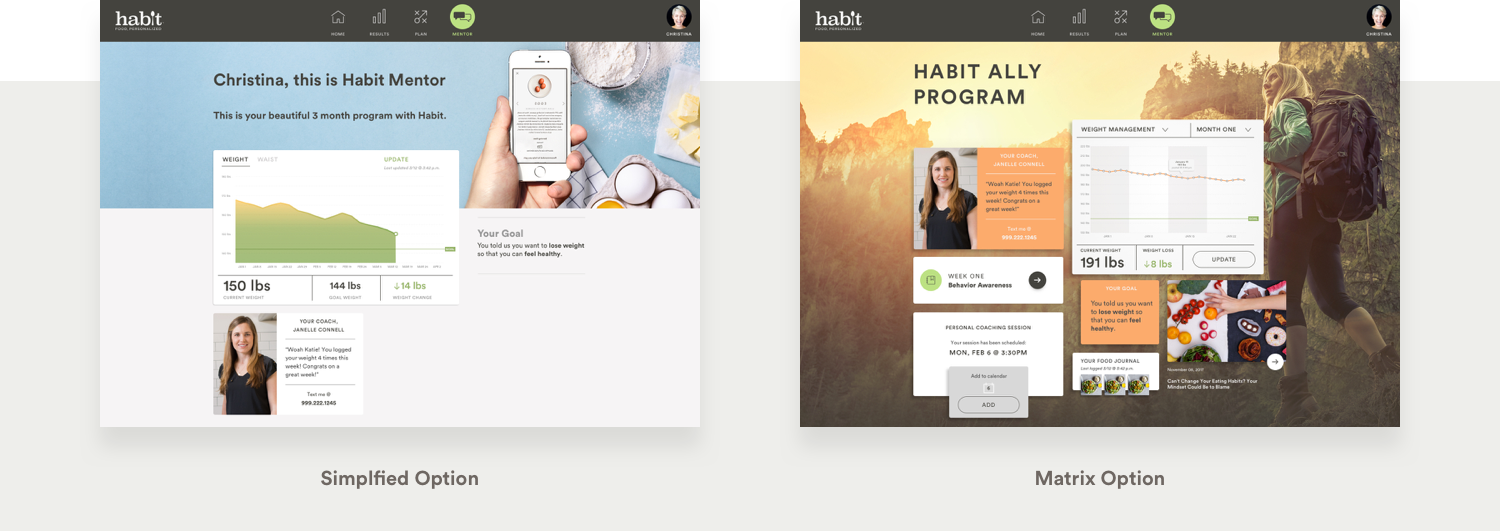 With all the feedback we received from interviews with both coaches and active Habit users, we created two designs to A|B test.