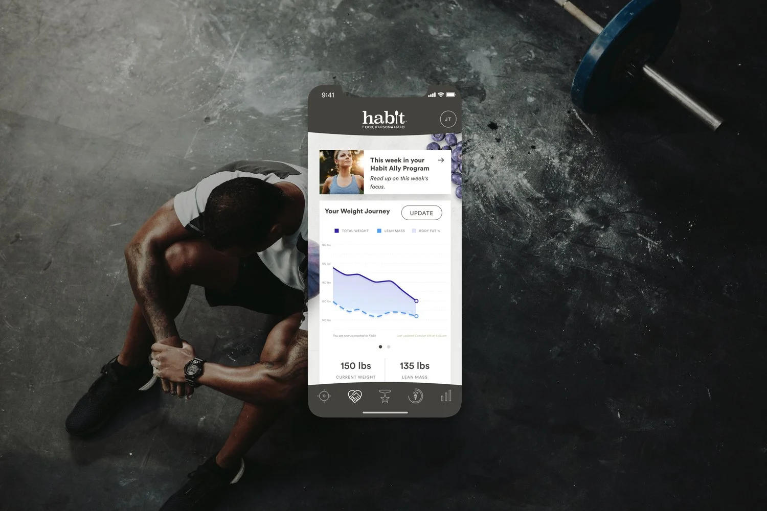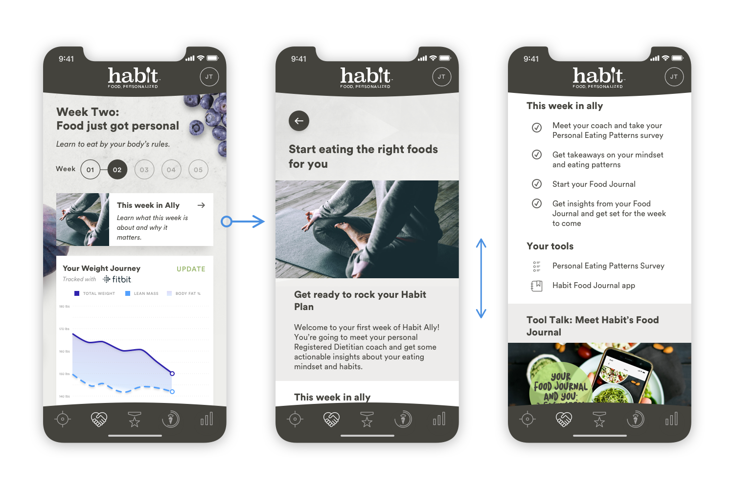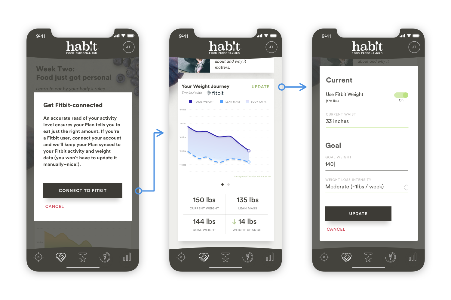 The coaching dashboard header includes the theme of the week as a user progresses through the 5-week program. The first option that changes weekly would be the article coaches want to share, and then the option to connect their Fitbit account for the most up to date trackable data. Below that in hierarchy would be their body fat tracking graph, and at the bottom would be personalized links to the Habit app to set goals as often as they’d like.