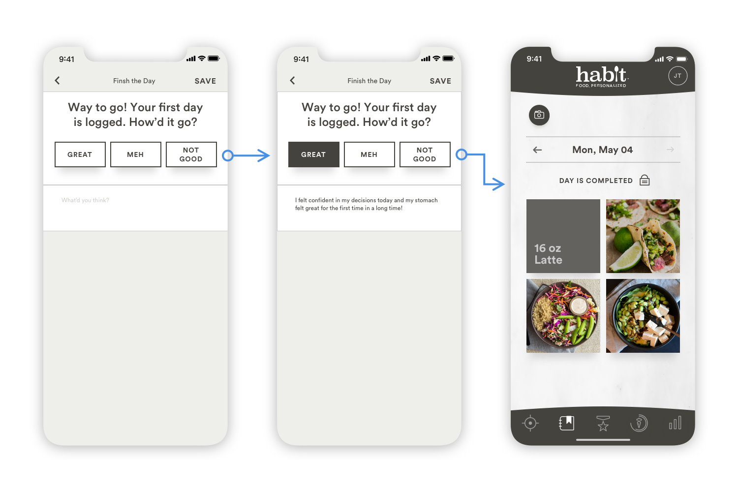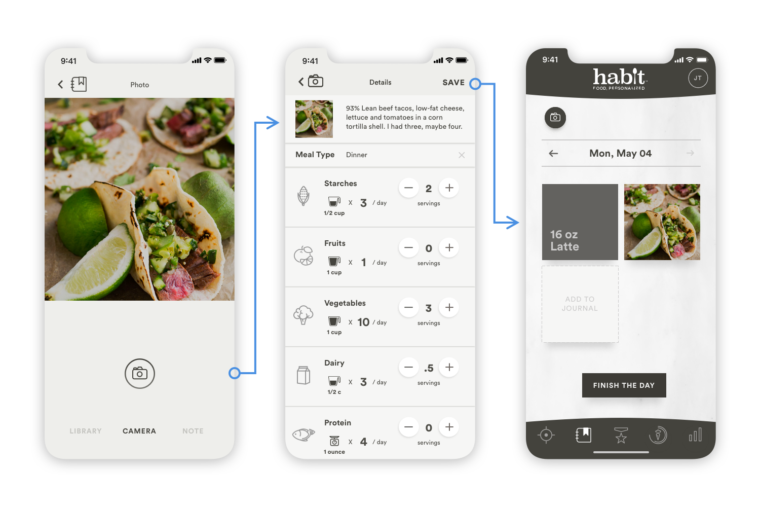 The Photo Food Journal gives users a low touch way to engage with Habit by photo-documenting their dietary habits. It also allows coaches to visualize the user’s habits and call out areas for improvement with respect to the content, quantity and time of each of the meals. Our main objective was to determine the best method for capturing and journaling food photos in the existing app, as well as instruct users on portion sizing.