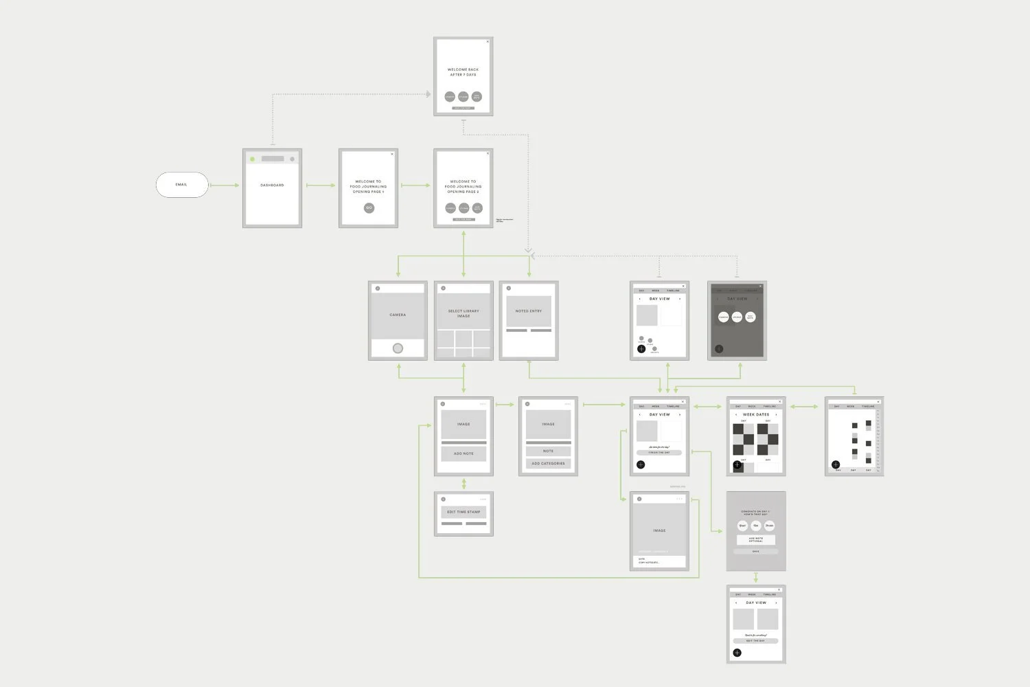 Our goal was to create a simple user centered design application that could easily upload meal images with critical details for our coaches. We created user flows based on the user stories we created during the design sprint, and moved into some testable wireframes.