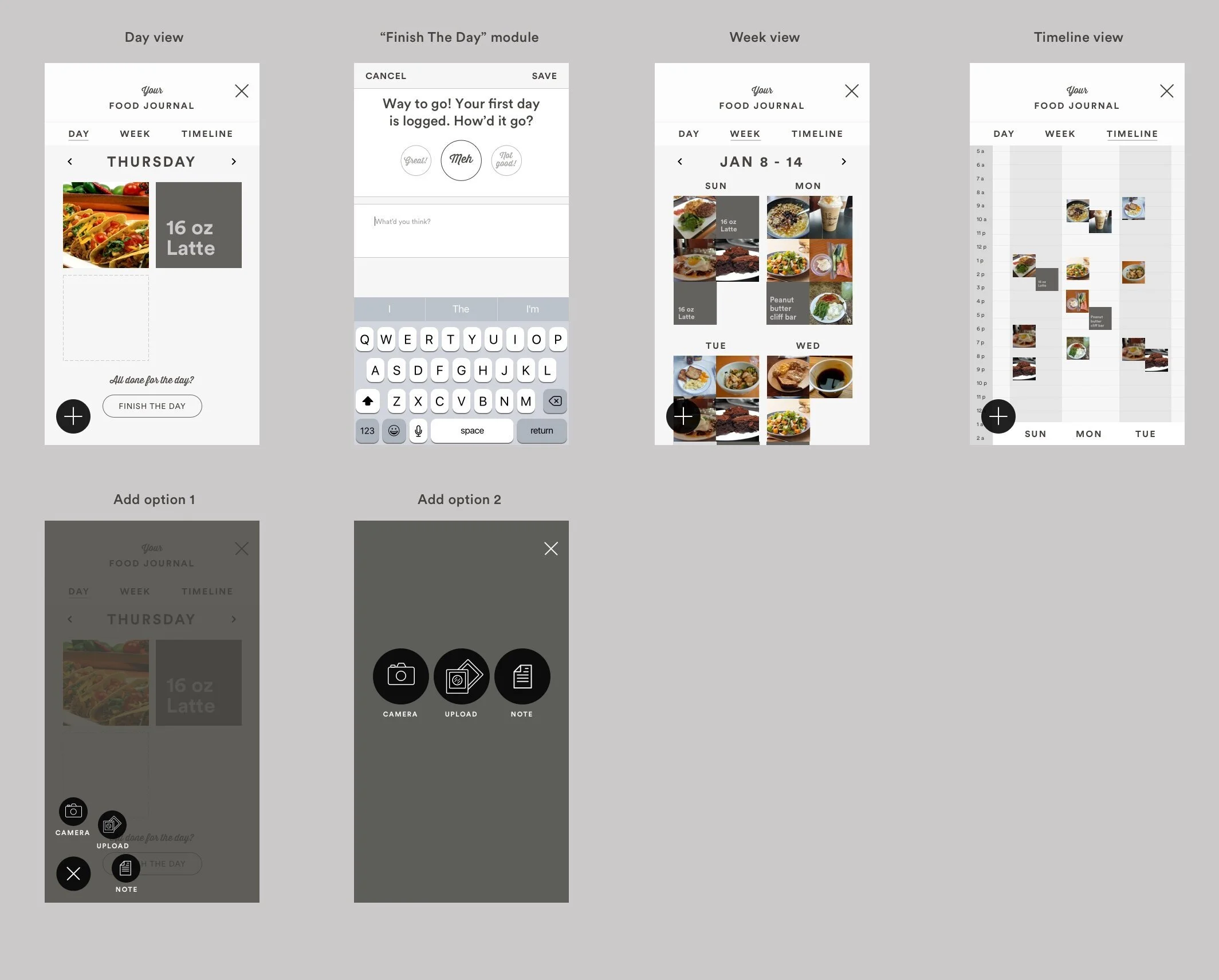 The final flow after user testing involved users taking a picture or uploading from their library. They also had the option to leave a note about their meal. But the most important piece of feedback was to add functionality that’ll help the user’s learn about meal portions.