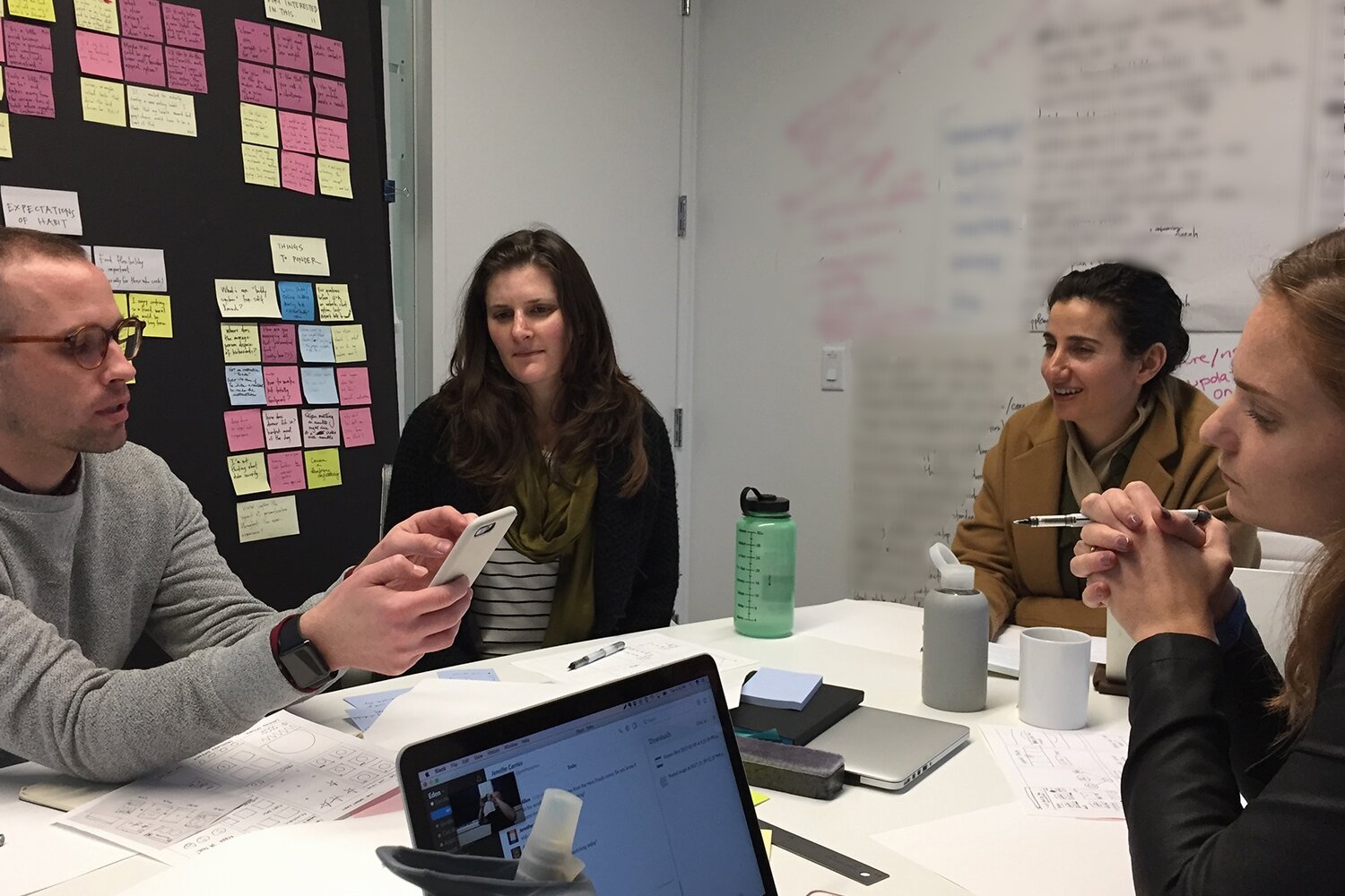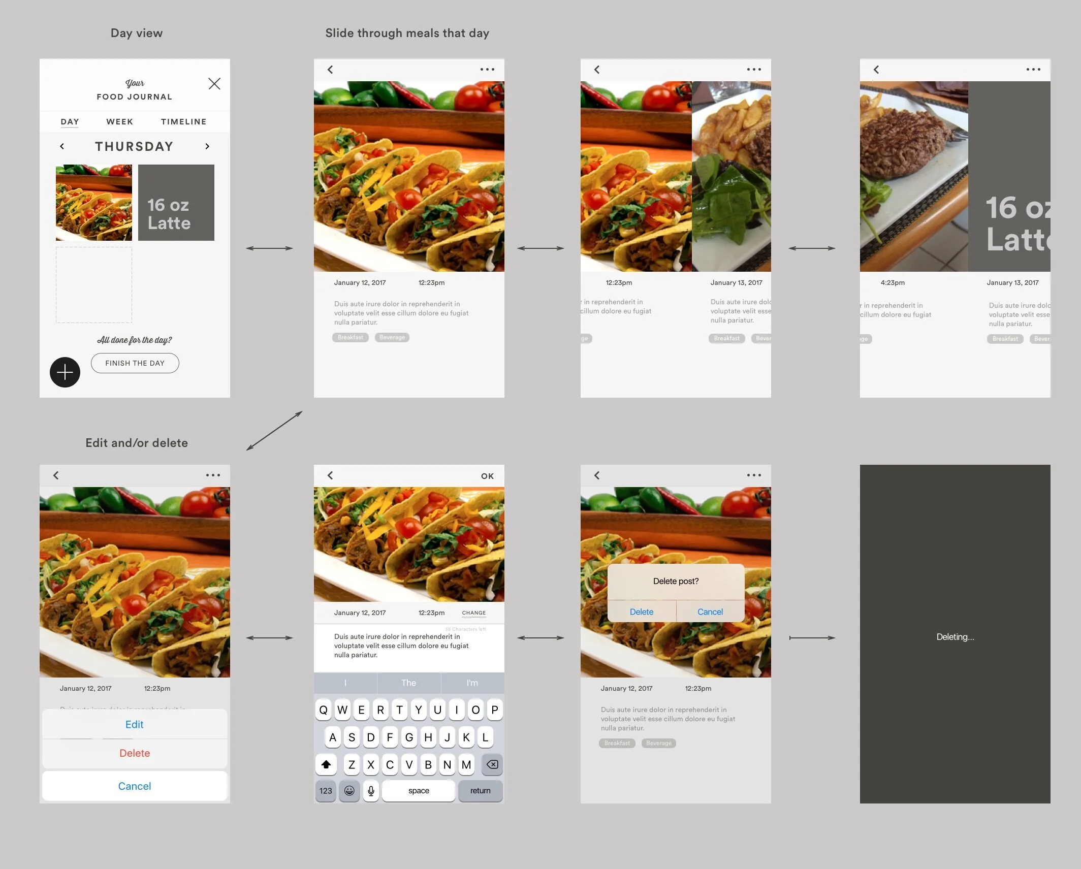 As a team, we brainstormed potential solutions and possible user flows. We unpacked how we will know if we got this right, how we will know if we failed, and discussed all the different ways how we might teach users about lifestyle changes through food logging. We interviewed current coaching program users about their experience and what they're hoping to achieve. After brainstorming we had a deciding together the flow and design direction the food photo journal should take.
