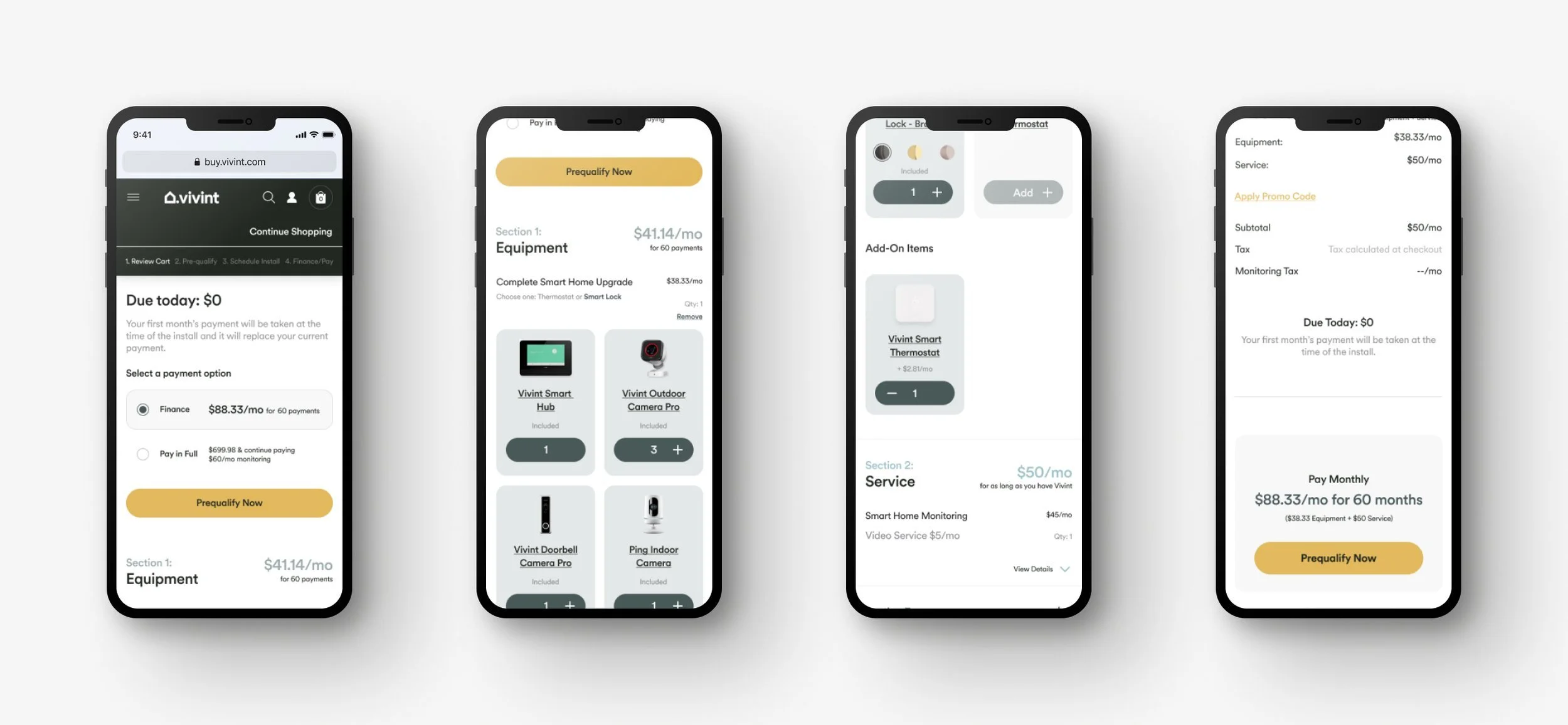 We wireframed the flow and developed early designs for testing the concept with actual current Vivint customers through usertesting.com. Our objective was to understand what information our customers needs when seeking to improve their security system.